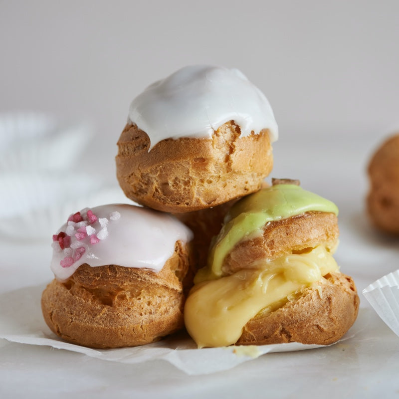 Light, golden choux filled with silky crème pâtissière and finished with a glossy glaze — Glenda’s choux pastries are the ultimate indulgence. Perfect for afternoon tea, celebrations, or gifting to someone special.